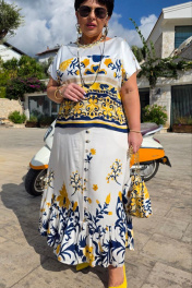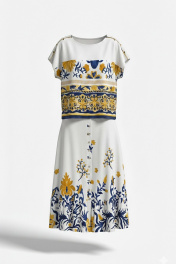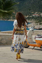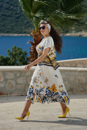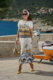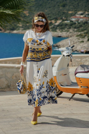 Костюм женский состоящий из блузы и юбки. Этот костюм — не просто одежда, а перенесённый на ткань кусочек итальянского лета. Яркий цветочный принт на светлой основе напоминает о залитых солнцем тосканских холмах, о внутренних двориках с терракотовыми горшками, о рынках, где горами лежат спелые овощи и фрукты. Это гимн средиземноморской радости жизни, воплощённый в блузе и юбке. Принт — это не случайный узор, а тщательно составленная композиция, вдохновлённая итальянской флорой и искусством. Блуза сконструирована так, чтобы быть одновременно удобной и изысканной. Крой — свободный, горловина округлой форм, линия плеча спущенная. По плечу декоративная застёжка в виде «навесных» петель и пуговиц, которая придаёт блузе лёгкости. По переду и спинке отрезная кокетка из однотона. В боковых швах от низа разрезы. Юбка — это продолжение блузы. Форма — трапециевидная, расширяющаяся от талии. Объём достаточный для свободы движения, но не переходящий в пышность. Длина «миди» создаёт более романтичный образ. Пояс в юбке притачной, на обтачке, по переду имитация застёжки на «навесные» петли и пуговицы. По низу юбки притачной волан со сборкой от подреза. Этот костюм для женщины, которая: любит жизнь — во всей её полноте и яркости. Ценит искусство — понимает, что одежда может быть произведением искусства. Обладает темпераментом — не боится быть заметной, но делает это со вкусом. Блуза 50 52 54 56 58 60 обхват груди 124 124 124 138 138 138 ширина по низу изделия 122 126 130 134 138 142 ширина рукава внизу 42 42 42 45 45 45 Юбка 50 52 54 56 58 60 ширина по талии 84 88 92 98 102 106 обхват бедер 132 136 140 144 148 152 ширина пояса 4,5 4,5 4,5 4,5 4,5 4,5