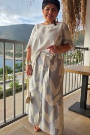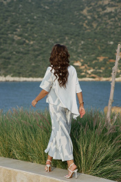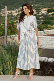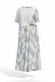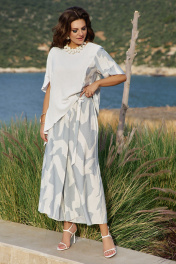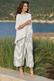 Летний комплект представляет собой гармоничное сочетание стиля и комфорта. В таком комплекте каждая деталь безупречно дополняет другую, создавая образ, который одновременно привлекает внимание и дарит ощущение комфорта. Этот наряд идеально подойдет как для прогулок по городу, так и для более камерных мероприятий, позволяя женщине чувствовать себя уверенно и очаровательно в летнее время. Блуза свободного силуэта гармоничном сочетании однотонного материала и декоративных вставок из ткани с принтом. Горловина в блузе округлой формы, по переду и спинке рельеф выходящий из проймы, по переду нагрудная вытачка. Рукав втачной с притачной с притачной манжетой с декоративным разрезом (рукав ассиметричный —левый из ткани с принтом, правый однотонный со вставкой в подрезе декоративного канта). Низа в блузе ассиметричный с декоративной треугольной вставкой по низу. Брюки-кюлоты свободного силуэта, длиной 7/8 расширяются к низу. Пояс притачной со вставкой эластичной тесьмы-резинки в задней части пояса, которая обеспечивает максимально удобную посадку на любой тип фигуры. В боковом шве застёжка на потайную тесьму-молнию и пуговицу в поясе. По переду кюлот из бокового шва отлетная деталь, фиксируется у пояса при помощи пряжек-полуколец. Длина блузы 61 см, длина рукава 40 см (р 52-56), 41 см (р 58-62). Длина брюк 92 см. Блуза 50 52 54 56 58 60 обхват груди 118 122 126 130 134 138 обхват бедер 132 136 140 144 148 152 ширина рукава вверху 40 42 44 46 48 50 Брюки 50 52 54 56 58 60 ширина по талии 80/95 84/99 88/103 92/107 96/111 100/115 обхват бедер 121 125 129 133 137 141