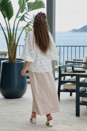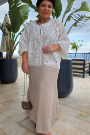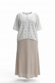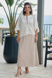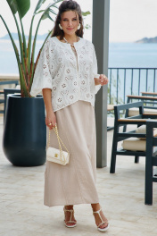 Костюм двухпредметный состоящий из блузы и юбки. Подойдет для повседневной носки и торжественных случаев в летний период. Костюм в романтическом стиле среднего объема полуприлегающего силуэта по геометрическому подобию напоминает трапецию. Пластическая форма мягкая, плавная.Блуза прямого силуэта, прилегание по груди достигнуто горизонтальными вытачками. Блуза без рукавов, линия низа фигурная, плавная.Юбка коническая, немного расклешённая к низу. На поясе по бокам для прилегания и комфорта движения вставлены резинки, застежка юбки на потайную молнию в среднем шве и пуговицу на поясе. Декоративными элементами по переду и спинке являются рельефы, в которые вставлена декоративная бахрома из основной ткани. Юбка на подкладке в длине миди.Стильный костюм с идеальной посадкой по фигуре подойдет вам как базовая вещь в гардеробе. Модель в тренде сезона комфортна на каждый день создает женственный элегантный образ. Комплект создан из качественных материалов, делает акцент на фигуру и идеален для капсульного гардероба. Длина блузы 63 см.ю длина плеча 8 см (р 52-56), 8,5 см (58-62). Длина юбки 92,5 см. Блузка 52 54 56 58 60 62 обхват груди 111 115 119 123 127 131 обхват талии 110 114 118 122 126 130 обхват бедер 118 122 126 130 134 138 Юбка 52 54 56 58 60 62 ширина по талии 84/112 88/116 92/120 96/124 100/128 104/132 обхват бедер 124 128 132 136 140 144 ширина пояса 4 4 4 4 4 4