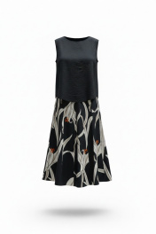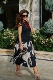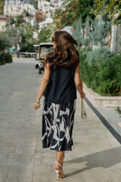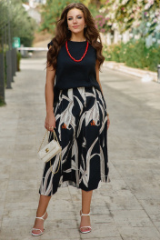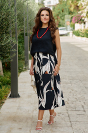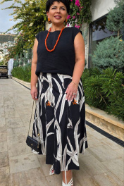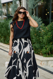 Юбка длины «миди», трапециевидного силуэта с декоративными вставками в виде отстроченных клиньев. Белые лепестки принта контрастируют с чёрным фоном юбки создавая акцент в образе. Отстроченные клинья создают динамику движения когда юбка колышется при ходьбе. Клинья расходятся от талии мягкими волнами, создавая объём там, где нужно, и облегая там, где требуется. Каждый шов — это тщательно продуманная линия, направляющая взгляд по изгибам фигуры. Юбка сидит по фигуре, но не обтягивает, оставляя пространство для лёгкого бриза. Пояс в юбке обтачной, со вставкой эластичной тесьмы резинки в бочках для удобной посадки на фигуру. В среднем шве спинки застёжка на потайную тесьму-молнию. Длина юбки 87 см (р 50-54), 88 см (56-60). Юбка 50 52 54 56 58 60 ширина по талии 80/89 84/93 88/97 92/101 96/105 100/109 обхват бедер 117 121 125 129 133 137