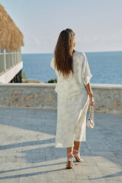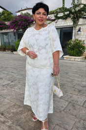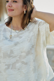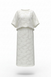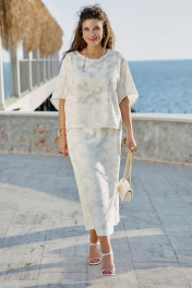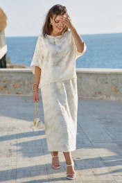 В мире, где часто приходится выбирать между практичностью и красотой, этот блузон предлагает третье — искусство повседневности, которое можно носить на себе, как вторую кожу, но которая гораздо интереснее первой. Летний блузон молочного оттенка с объёмным фактурным принтом — это не просто предмет одежды, а носимое искусство. Он сочетает в себе скульптурность рельефных узоров и нежность пастельного оттенка, свободный силуэт и сложную фактуру. Блузон свободного силуэта, укороченный. Горловина округлой формы. По переду и спинке блузона вертикальные рельефы. Рукав цельнокроеный с фигурной линией низа. По спинке блузона застёжка на тесьму-молнию. Низ в блузоне ассиметричный. Советы по носке: не перегружать аксессуарами — фактура уже самодостаточна, сочетать с простым низом — чтобы блузон был звездой образа, играть с длиной — заправлять или носить навыпуск. Длина блузон 63 см, длина рукава 42 см (р 50-54), 43 см (р 56-60). Блузон 50 52 54 56 58 60 обхват груди 146 146 146 158 158 158 ширина изделия внизу 124 128 132 136 140 144 ширина рукава внизу 44 44 44 47 47 47