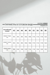 Блуза женская полуприлегающего силуэта. Передняя часть с нагрудными выточками. Пройма с кружевным крылышком. Горловина переда окантована. Спинка с рельефами. Центральная деталь спинки выполнена из кружева. В горловину спинки вставлена завязка. Длина изделия: (р.42, 44, 46) - 60 см. Длина изделия: (р.48, 50, 52) - 65,5 см. Длина изделия: (р.54, 56, 58) - 70 см. Уход: ручная стирка при температуре не выше 30 С.