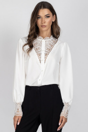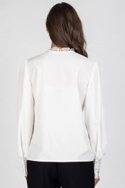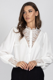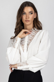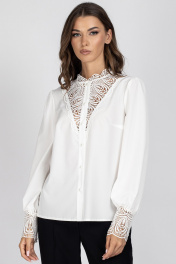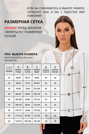 Блузка женская, полуприлегающего силуэта. Перед с нагрудными вытачками и центральной бортовой застежкой, выполненной из кружева. Спинка цельная. Горловина блузы с притачной стойкой из кружева. Рукав втачной со сборкой по окату и низу. Низ рукава с притачной манжетой из кружева, застегивающийся на 3 петли и пуговицы. Длина изделия в размерах 44, 46, 48 - 60 см. Длина изделия в размерах 50, 52, 54 - 62 см. Длина изделия в размерах 56, 58, 60 - 63 см. Длина рукава - 65 см. Уход: бережная стирка при температуре не выше 30°С.