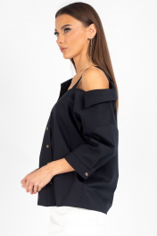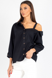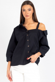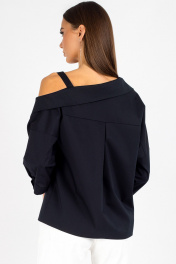 Блузка прямого силуэта со спущенным плечом. Горловина ассиметричная с воротником и бретелей на левом плече. Перед с косой застежкой на 6 петель и 7 пуговиц. Спинка с кокеткой и встречной складкой. Рукав 3/4 с манжетой на 1 петлю и пуговицу. Уход: бережная стирка при температуре не выше 30°С. "