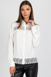 Женская блузка полуприлегающего силуэта, сочетающая строгость кроя с изысканными акцентами. Передняя часть c нагрудными выточками, обеспечивающими комфортную посадку. Центральная бортовая застёжка — на 6 или 7 пуговиц (в зависимости от размера), придаёт образу классическую завершённость. Особое внимание привлекает кружево, изящно нашитое в верхней и нижней части переда — оно добавляет лёгкости и утончённости, делая блузку особенно женственной. Спинка цельнокроеная, без дополнительных швов, что подчёркивает чистоту силуэта. Рукава втачные, с элегантной линией плеча. Низ рукава оформлен притачной манжетой, застёгивающейся на две пуговицы — аккуратный акцент, подчёркивающий запястья и гармонирующий с кружевными деталями. Воротник рубашечного типа с отрезной стойкой — строгий, но изящный элемент, который придаёт изделию архитектурную чёткость и завершённость. Его форма удачно балансирует между классикой и романтичным стилем. Уход: бережная стирка при температуре не выше 30°С.