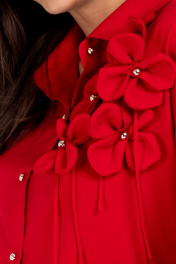 Блузка женская OVERSIZE, прямого силуэта со спущенным плечом. Перед из двух частей с центральной бортовой застежкой на 6 петель и пуговицу. Отделочным элементом блузки является 5 цветков, настроченные пуговицами. Спинка цельная. Рукав с притачной манжетой, застегивающейся на 1 петлю и пуговицу. Воротник рубашечного типа с отложной стойкой. Уход: бережная стирка при температуре не выше 30°С.