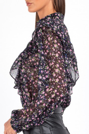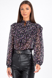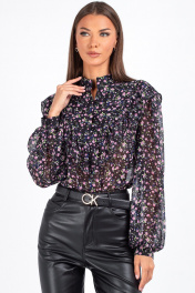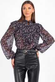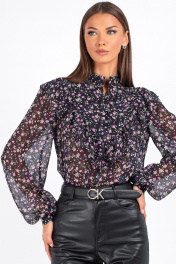 "Женская блузка с цветочным принтом и рюшами Откройте для себя утонченную женственность с нашей стильной блузкой полуприлегающего силуэта. Эта модель идеально подойдёт для офиса, создания романтичного, но уверенного образа — будь то деловая встреча или вечерняя прогулка. Полочка с нагрудными выточками обеспечивает комфортную посадку и подчёркивает линию груди. Фигурная кокетка украшена рюшей, плавно переходящей на спинку — изысканный акцент, придающий образу динамику. Застёжка на три навесные петли с декоративными пуговицами по переду добавляет шарм. Втачные рукава со сборкой по окату создают объём и воздушность, а низ на резинке мягко фиксирует рукав, не сковывая движений. Воротник-стойка подчёркивает линию шеи и добавляет нотку строгости, уравновешивая романтичный принт. Блузка с длинным рукавом выполнена из ткани с цветочным принтом — мелкие розовые, сиреневые и зелёные цветы на чёрном фоне создают эффект глубины и утончённости. Идеально сочетается с кожаными брюками, юбками и классическими джинсами. Уход: бережная стирка при температуре не выше 30°С."