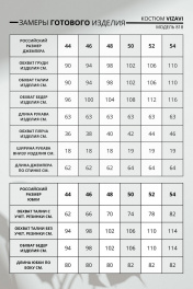 Костюм женский, состоит из джемпера и юбки. Джемпер прямого силуэта. Передняя часть цельная. Рукав втачной с притачной манжетой. Отделочным элементом джемпера является кружево. Юбка прямого силуэта, на подкладке. В боковых швах юбки имеются разрезы. Уход: бережная стирка при температуре не выше 30°С.