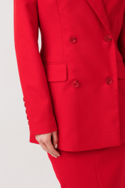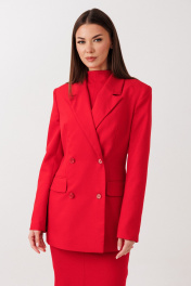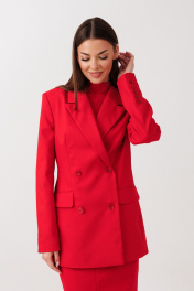 Жакет: – свободный силуэт – на подкладке – рукав втачной, двухшовный; на рукаве петли-пуговицы – застёжка петли-пуговицы – двухбортный – карманы по переду с клапаном – воротник пиджачного типа.