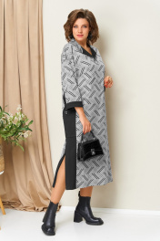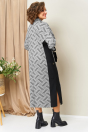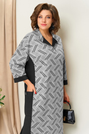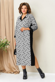 Удлиненное платье из трикотажа прямого силуэта с разрезами и карманами. Длина платья- 124 см по центру спинки. Горловина платья- открытый воротник- полустойка.