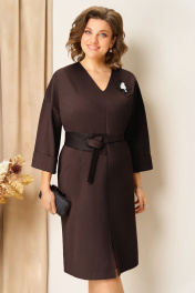 Элегантное лаконичное платье из эластичного трикотажа прямого полуприлегающего силуэта с акцентной V-образной горловиной. Центральный элемент отделки платья- вставки из кожи и необычная съемная брошь для легкости образа. Длина платья немного за колено, уместная в большинстве ситуаций. Спереди небольшой вырез для максимального удобства. Длина платья по центру спинки- 104см. Декоративный и функциональный пояс- в комплекте изделия.