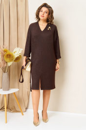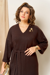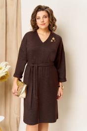 Нарядное платье из эластичного трикотажа с легким мерцающим эффектом, прямого полуприлегающего силуэта с акцентной V-образной горловиной. Рукава платья на цельнокроеной основе, длиной 7/8. Длина платья по центру спинки- 104см.. Спереди небольшой вырез для максимального удобства. Платье украшено пришивными геометричными пуговицами. Пояс- в комплекте изделия.