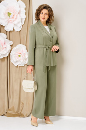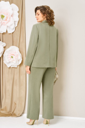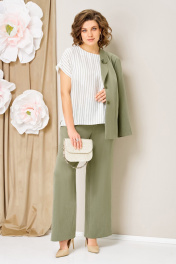 Элегантный комплект-тройка: жакет с воротником шаль, без подкладки, с застежкой на пуговицы, брюки свободного кроя и блуза с рисунком в тон основной ткани. По бокам жакета небольшие разрезы.Длина жакета по спинке-65 см. Длина рукава- 63 см. Брюки прямые с высокой посадкой и притачным поясом со вставками с резинкой. Длина брюк по боковому шву- 102см..Длина блузы по центру спинки- 60см. В комплекте изделия- пояс из текстиля и брошь.