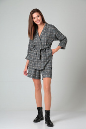 Костюм женский выполнен из трикотажного полотна, состоящий из жакета и шорт. Жакет свободного силуэта без застежки. Воротник отложной с лацканом. Рукав втачной со спущенным плечом, заканчивающийся мягкой манжетой. Длина рукава от горловины для роста 164 см 66 см, для роста 170 см 68 см. В боковых швах расположены карманы. Длина жакета от плеча для роста 164 см 75 см, для роста 170 см 78 см. Шорты свободные, пояс на широкой резинке. По переду имитация «застежка-гульфик». По бокам шорт расположены карманы. Длина шорт от пояса для роста 164 см 41 см, для роста 170 см 43 см. Пояс из основной ткани в комплекте.