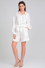 Костюм женский, состоящий из шорт и блузки. Блузка – рубашка со спущенным плечом, свободного силуэта. Рукав заканчивается мягкой манжетой. Воротник отложной на стойке. Застежка на петли и пуговицы. Низ фигурный. На полочке расположены накладные карманы. Длина рукава от горловины для роста 164 см 73 см, для роста 170 см 75 см. Длина изделия от плеча для роста 164 см 80 см, для роста 170 см 83 см. Шорты свободные, пояс на широкой резинке. По переду имитация «застежка-гульфик». По бокам шорт расположены карманы. Длина шорт от пояса для роста 164 см 41 см, для роста 170 см 43 см.