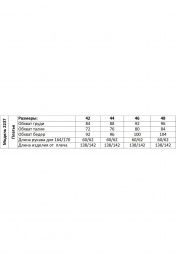 Платье выполнено из трикотажного полотна, приталенного силуэта, расклешенное к низу. Горловина округлая. Рукав втачной, расширенный к низу. Длина рукава 60 см (для роста 164 см)/ 62 см (для роста 170 см. Длина платья от плеча по спинке 138 см (для роста 164 см)/ 142 см (для роста 170 см).