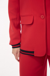 Женский брючный костюм станет стильным и эффектным решением для вашего гардероба. Модель сочетает в себе классический крой с современными спортивными элементами, что делает её универсальной как для офиса, так и для неформальных встреч. Жакет однобортный, прямого силуэта с воротником пиджачного типа и центральной застежкой на пуговицы. Уникальность модели подчеркивают контрастные чернокрасные полосатые довязы на воротнике, по низу рукава, и по нижнему краю жакета. Имеются функциональные карманы с клапанами. Рукав втачной. Длина рукава от плеча для роста 164 см 61 см, для роста 170 см 63 см. Длина жакета от плеча по спинке для роста 164 см 70 см, для роста 170 см72 см. Брюки прямые, с карманами в боковых швах. Пояс - довяз. По низу брюк вставлена тесьма-резинка круглая с фиксатором (для изменения формы брюк). Длина брюк от талии для роста 164 см 107 см, для роста 170 см 110 см. Жакет Размеры: 44 46 48 Обхват груди 98 102 106 Обхват талии 96 100 104 Обхват бедер 102 106 110 Длина рукава для 164/170 61/63 61/63 61/63 Длина изделия от плеча для 164/170 70/72 70/72 70/72 Брюки Обхват талии 76 80 84 Обхват бедер 108 112 116 Длина брюк для 164/170 107/110 107/110 107/110