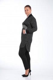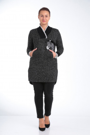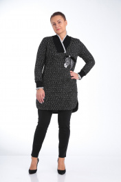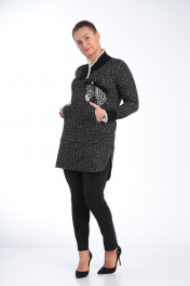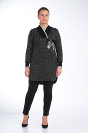 Комплект женский брючный состоит из удлиненной туники и брюк. Туника прямого силуэта из мягкого ,трикотажного ,буклированного полотна. По переду настрочен карман «кенгуру».Изделие декорировано настроченой мягкой аппликацией в виде зебры на левом боку.Вырез V образный из довяза. Рукав одношовный, втачной ,длинный на манжете из довяза.Длина изделия до колена. Брюки узкие из масло-кожа на флисе .По переду два кармана,имитация застежки, по спинке кокетки. Пояс на резинке.