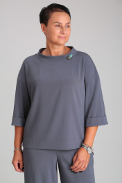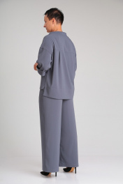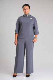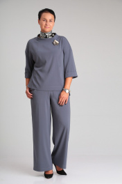 Комплект женскийбрючны из костюмной ткани.Блуза свободного кроя. Спинка на кокетке. В верхней части кокетки две вытачки.,выходящие из горловины.Плечо спущено. Рукав втачной,олношовный с притачной завернтой манжетой,длиной 3/4.Горловина круглая со стойкой отстающей от шеи. Спинка длинне полочки на 6см,в боковых швах два разреза.Брюки прямые ,широкие,по задним половинам вытачки. Пояс притачной на резинке.