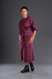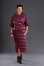 Комплект женский состоит из джемпера и юбки из трикотажной ткани дизайн кожаная полоска.Джемпер прямой,чуть ниже талии. Рукав летучая мышь на пате с двумя пуговицами и петлями,вырез горловины-лодочка. Предлагается с декоративной брошью,дающей возможность регулировать ширину изделия.Юбка колокол. По переду имтация косого запаха,переходящая в функционалную застежку на петли и пуговицы. В боковых швах косые карманы. Пояс втачной а обтяжке.