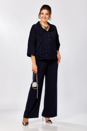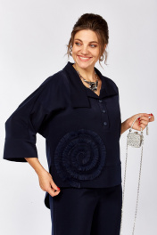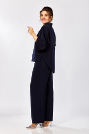 Костюм женский брючный из плотной костюмной ткани. Блуза прямого силуэта. По полочке горизонтальный подрез в области талии. Декор в виде цветка настрочен на правой стороне полочки. Спинка с цельнокроеной кокеткой. Нижняя часть на запах из деталей с фигурным низом. Рукав летучая мышь с широкой манжетой по низу. По боковым швам разрезы. Брюки прямого силуэта. Пояс притачной с резинкой в районе боковых швов. Застежка центральная на молнию с гульфиком. В боковых швах два кармана с округлым входом. По спинке две вытачки. Длина блузы по среднему шву 72-74 см, длина рукава от воротника 59см, длина брюк 105-107см. Декор может отличаться от представленного на фото.