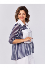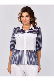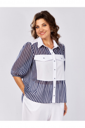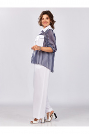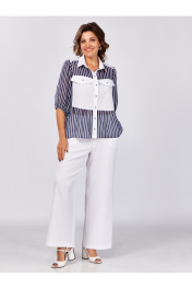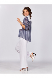 Комплект женский, состоящий из блузы и брюк. Блузка свободного кроя с центральной застежкой на 8 петель и пуговиц. Воротник отложной на отрезной стойке. На спинке кокетка, переходящая на полочку, от которой выполнена легкая сборка. На полочке подрезы с имитацией кармана с клапаном в верхней части. От нижнего подреза легкая сборка. Рукав 7/8 на эластичную тесьму по низу и легкой сборкой по окату. Брюки прямого силуэта на притачном поясе на резинку, без застежки. В боковых швах внутренние карманы.